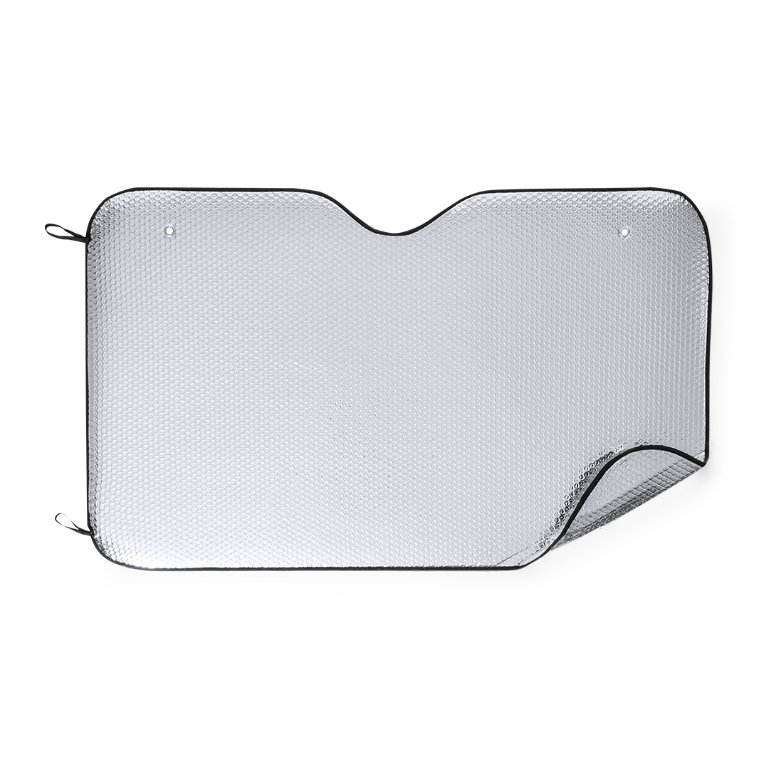 Para-Sol Falnit alumínio com bolha de ambos os lados em acabamento metálico prateado com tubulação preta. Tamanho 130x80cm, com anéis de reforço de metal, tiras elásticas para dobrar, dois copos de sucção para ajuste e apresentação se desdobraram para fácil impressão.