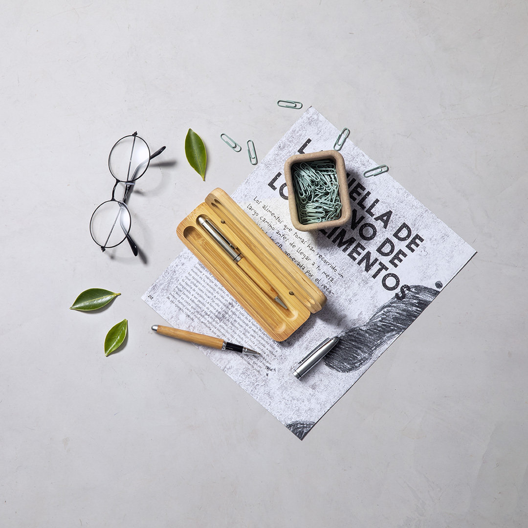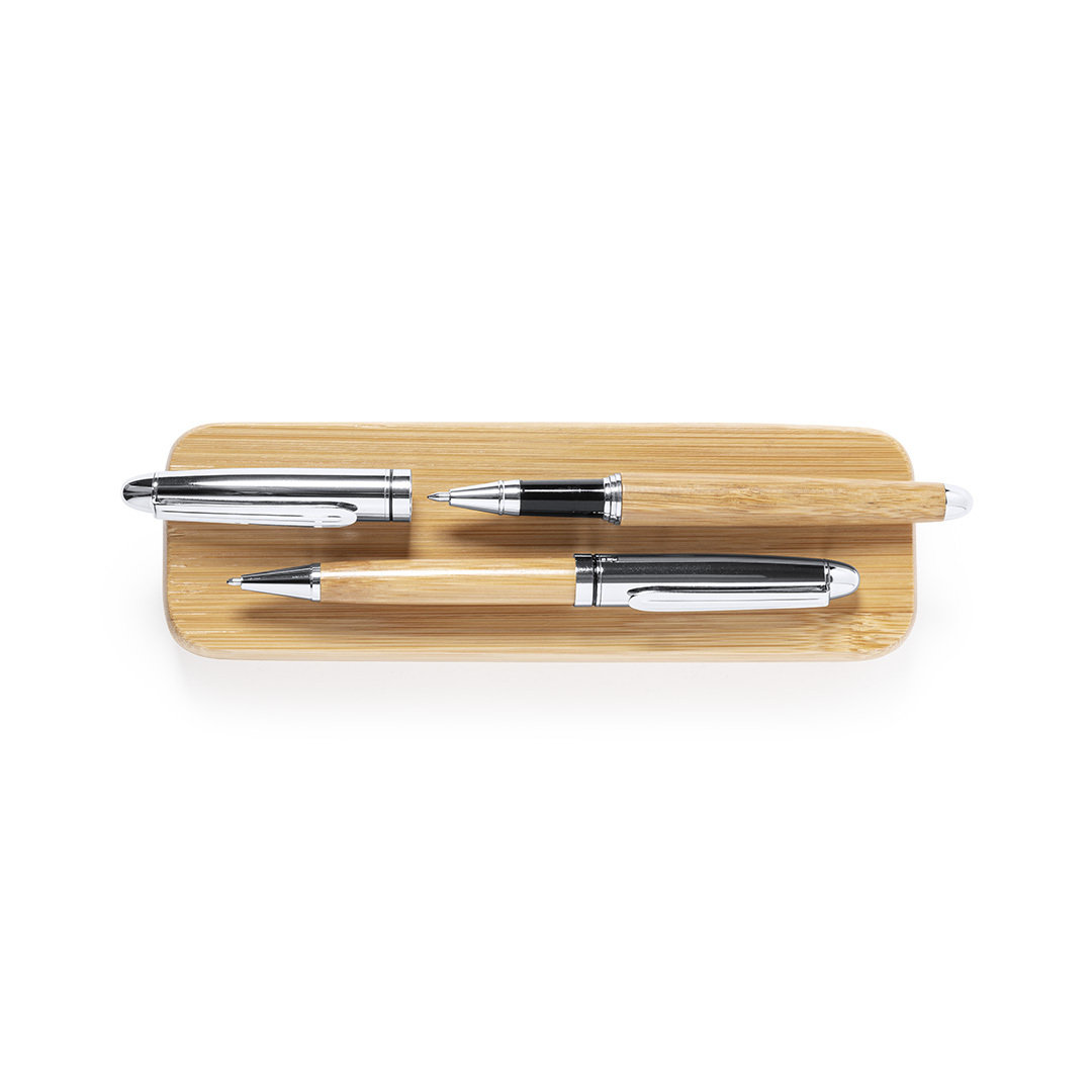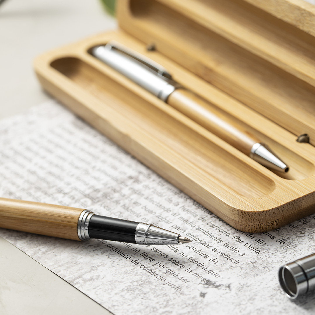 Conjunto de Esferográfica e Roller Notium da Linha Natura. Fabricado numa combinação de Bambu com Metal, para assim fomentar a utilização de matérias primas naturais e reduzir as emissões contaminantes. Esferográfica de mecanismo giratório com tinta azul. Roller com tampa, tinta gel azul e carga jumbo. Apresentado em estojo individual de bambu.