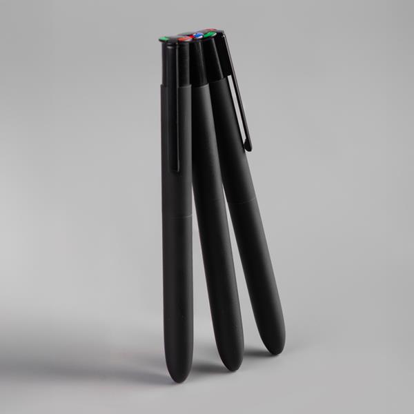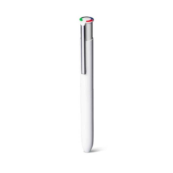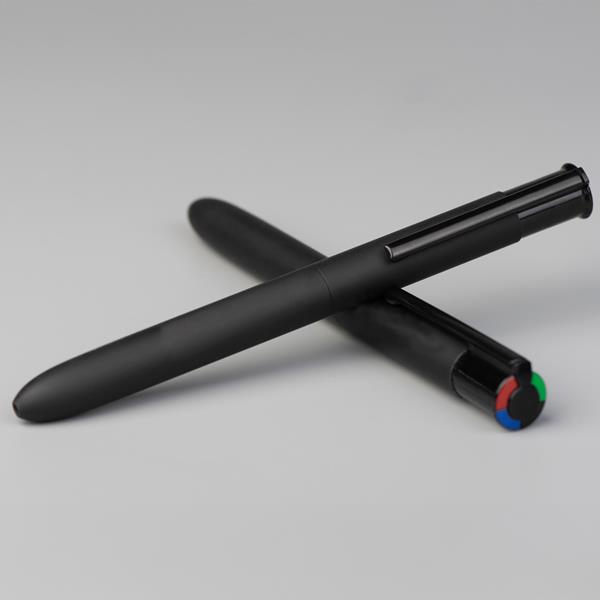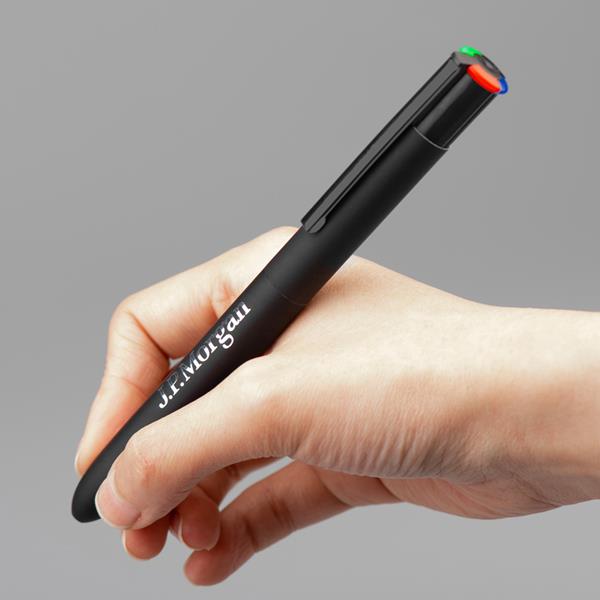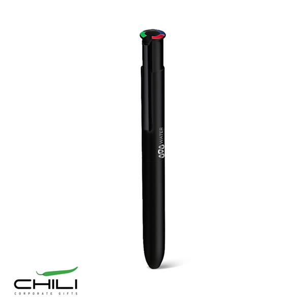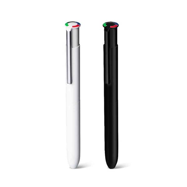 Esferográfica 4 Color Multifunções com corpo em Alumínio Reciclado, acabamento mate e zonas em borracha para maior conforto. Tinta alemã de alta qualidade nas cores preta, azul, vermelha e verde. Ideal para o uso diário.