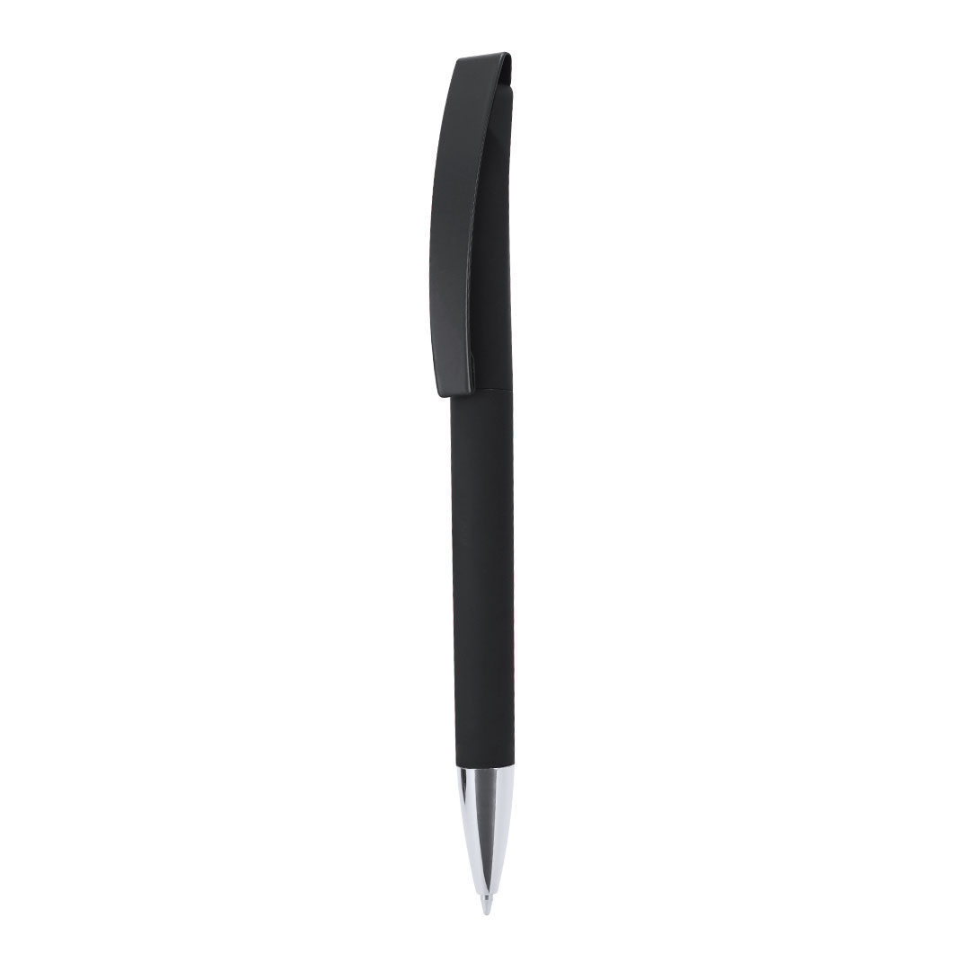 Esferográfica Chic de mecanismo de botão. Ponta de acabamento metálico. Corpo acabado em borracha, clip especialmente concebido para marcação a laser com efeito espelho. Em tinta azul.