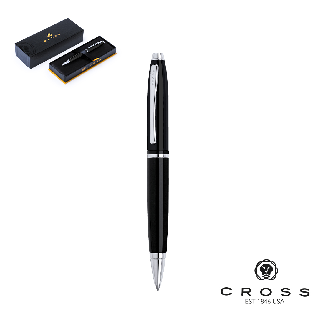 Esferográfica Cross Calais com Mecanismo Retrátil, Corpo de metal com acabamento suave e clipe original com logotipo. Apresentada em um elegante estojo individual preto, com o logotipo da marca e interior macio semelhante a camurça. Com tinta preta.