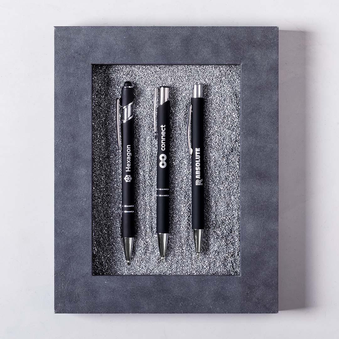 Esferográfica Lekor com Mecanismo de Pressão e Touch, Feita de Alumínio. Acabamento emborrachado, especialmente projetado para personalização a laser, revelando o logotipo em tom prateado. Acessórios cromados e clipe correspondente incluídos. Tinta azul.