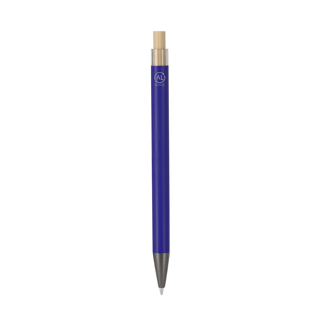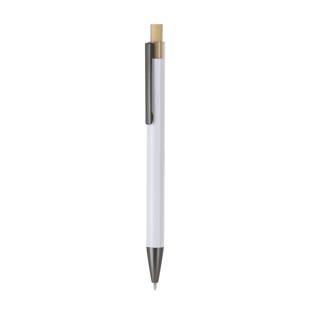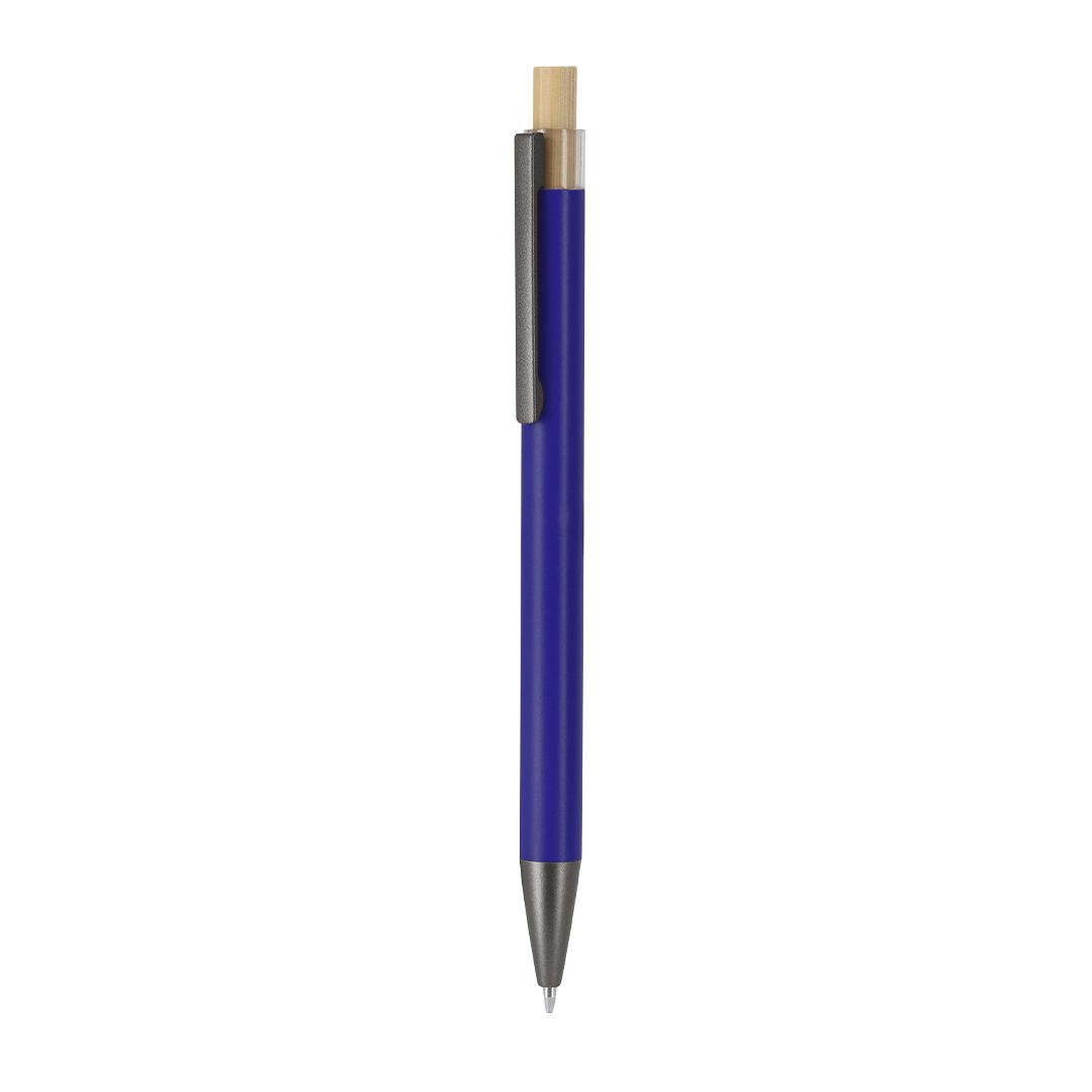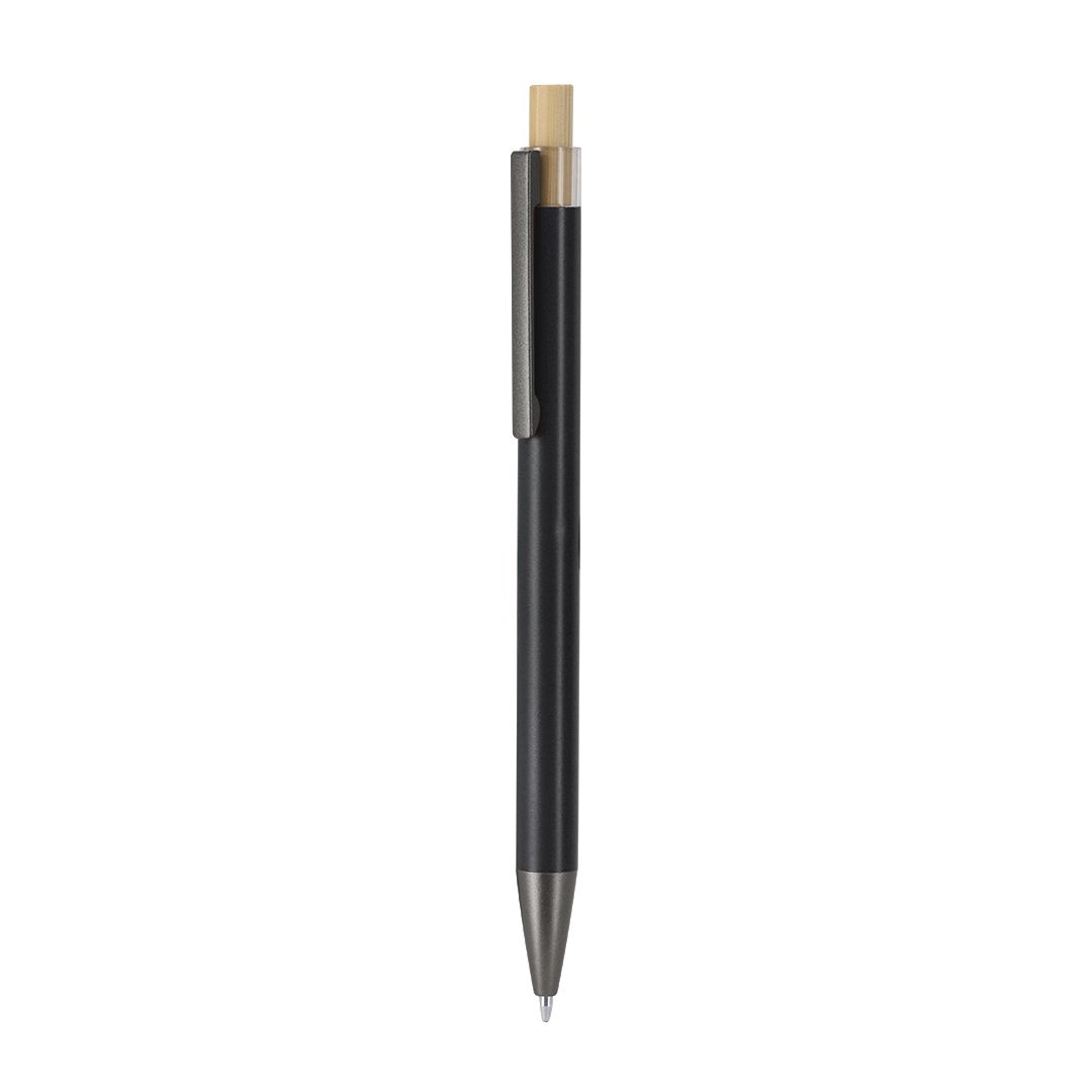 Botão de bambu com corpo cinzento mate. Clip e ponta pretos. Jumbo a carregar e em tinta azul.