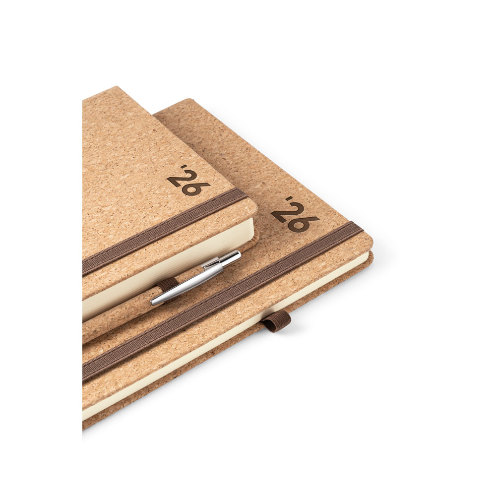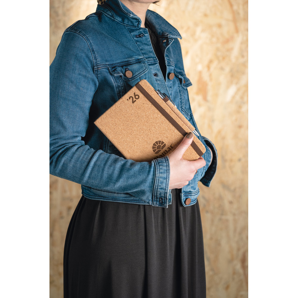 Agenda Diária Pomar A5. Possui um suporte para esferográfica (não incluída) e marcador em fita. Está organizada num plano diário, com páginas feitas de material certificado FSC™ e outros materiais controlados. Fornecida com bolsa de non-woven