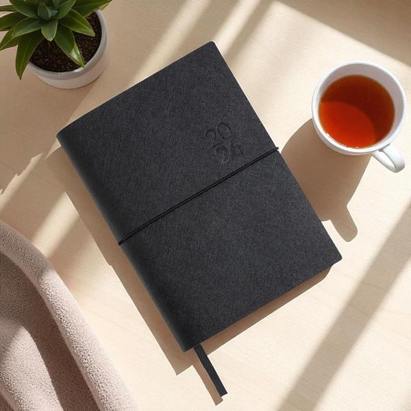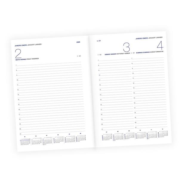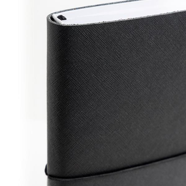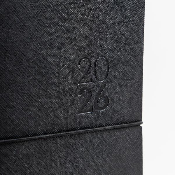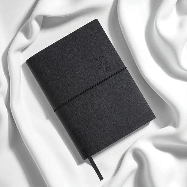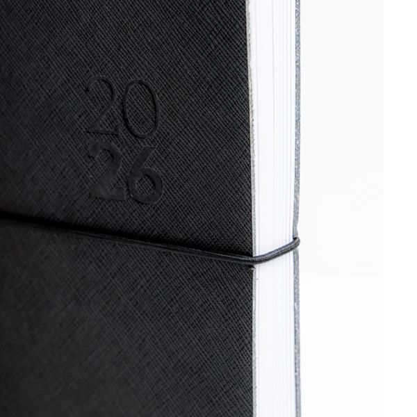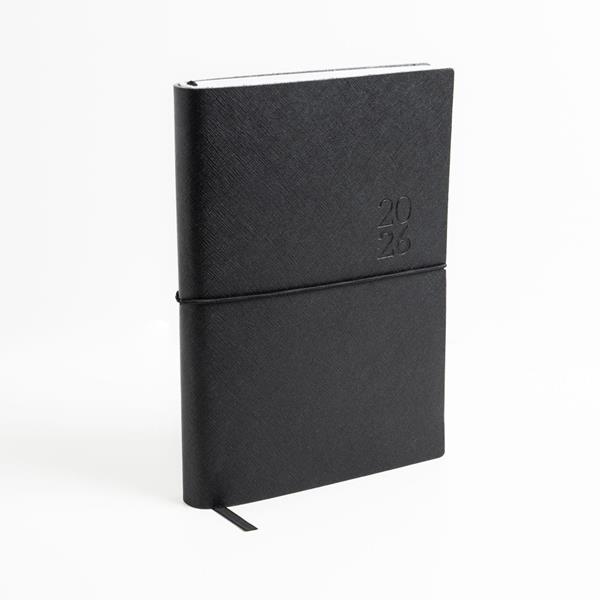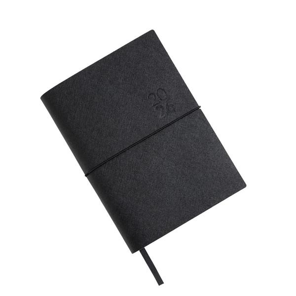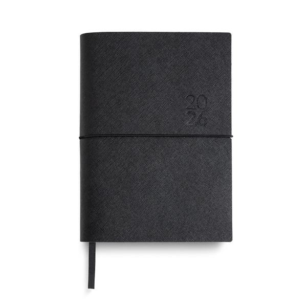 Agenda Diária A5 Milano. Capa em Mistura de Pele com 67% Fibras Naturais, elástico tubular horizontal e fitilho preto. Com 336 páginas, em papel branco 70gr e certificação FSC (papel proveniente de florestas geridas de forma responsável). Idioma principal: Português e Espanhol. No interior inclui: espaço para preenchimento de dados pessoais; calendários: 2022, 2023, 2024; feriados em lista; plano de férias; plano diário 2023; plano diário 2024 e espaço para preenchimento de contactos importantes (de A-Z).