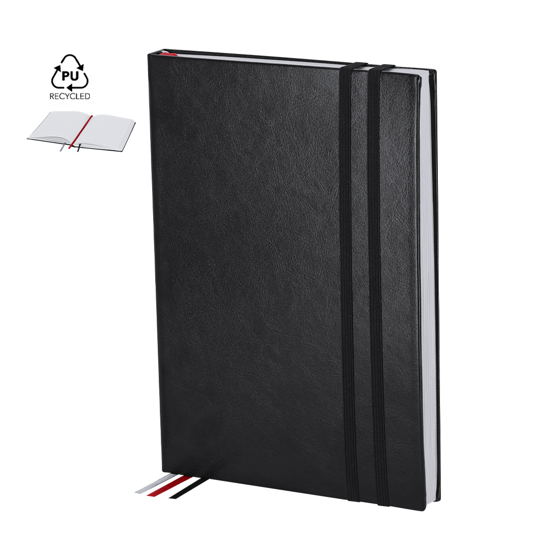 Bloco de Notas Suran tamanho A5 com capas rígidas e macias, feito de PU e RPET reciclados. Marque na fita em três cores diferentes (preto, vermelho e cinzento) para facilitar o planeamento diário e para uma fita elástica dupla a condizer. Inclui 128 folhas brancas com disposição às riscas e um bolso de papel prático para notas soltas. Ideal para manter um diário e planear ao longo do ano. Com o emblema de PU reciclado.