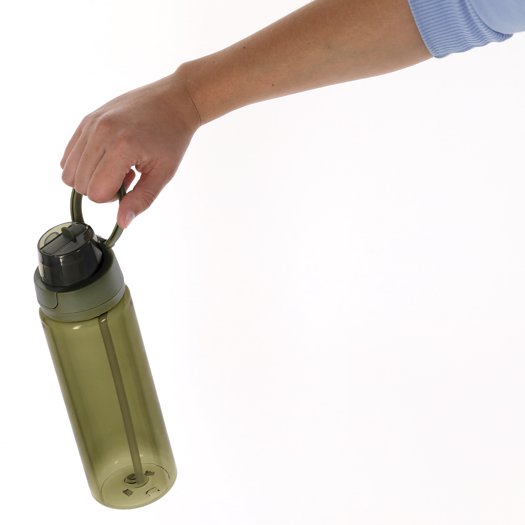 Garrafa Felyca com capacidade de 750ml, feita de RPET resistente e com acabamento translúcido. Com sistema duplo de bebida, palhinha e buraco para beber. Tampa de fecho de empurrar e puxa dobrável. Livre de BPA.