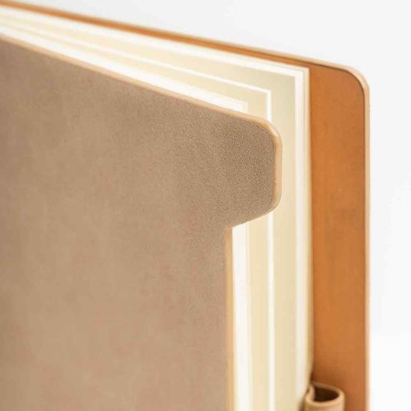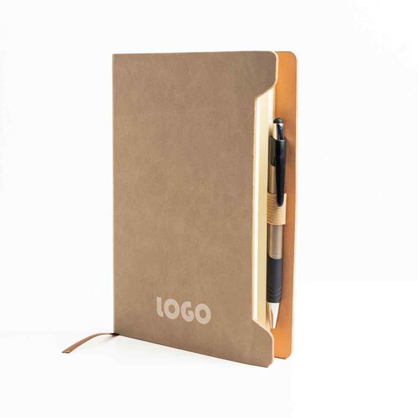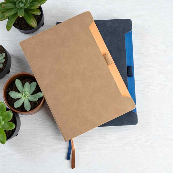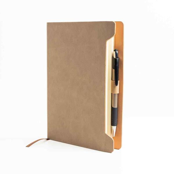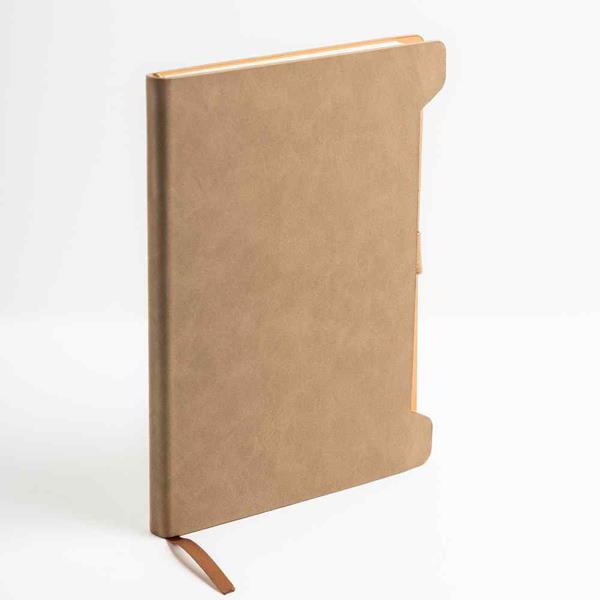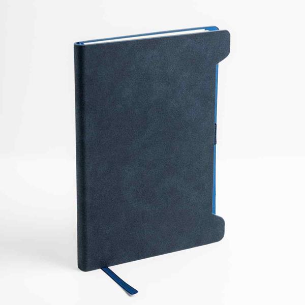 Bloco de Notas A5 Softnote com capa em RPU suave e suporte para esferográfica. A capa de cantos arredondados possui uma textura lisa e sofisticada, proporcionando uma sensação agradável ao toque. O interior é composto por 96 folhas lisas de cor marfim certificadas pelo FSC, garantindo sustentabilidade. O suporte lateral mantém a esferográfica protegida e sempre à mão, oferecendo praticidade e elegância.
