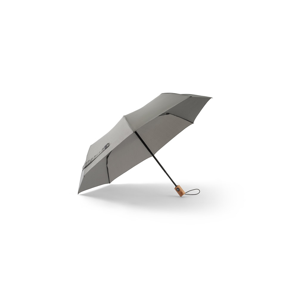 Guarda-Chuva River rPET 190T Pongee, com Varetas em Fibra de Vidro e Pega em Madeira. Guarda-chuva dobrável em 3 secções, com Abertura e Fecho Automático e à Prova de Vento. Fornecido em bolsa