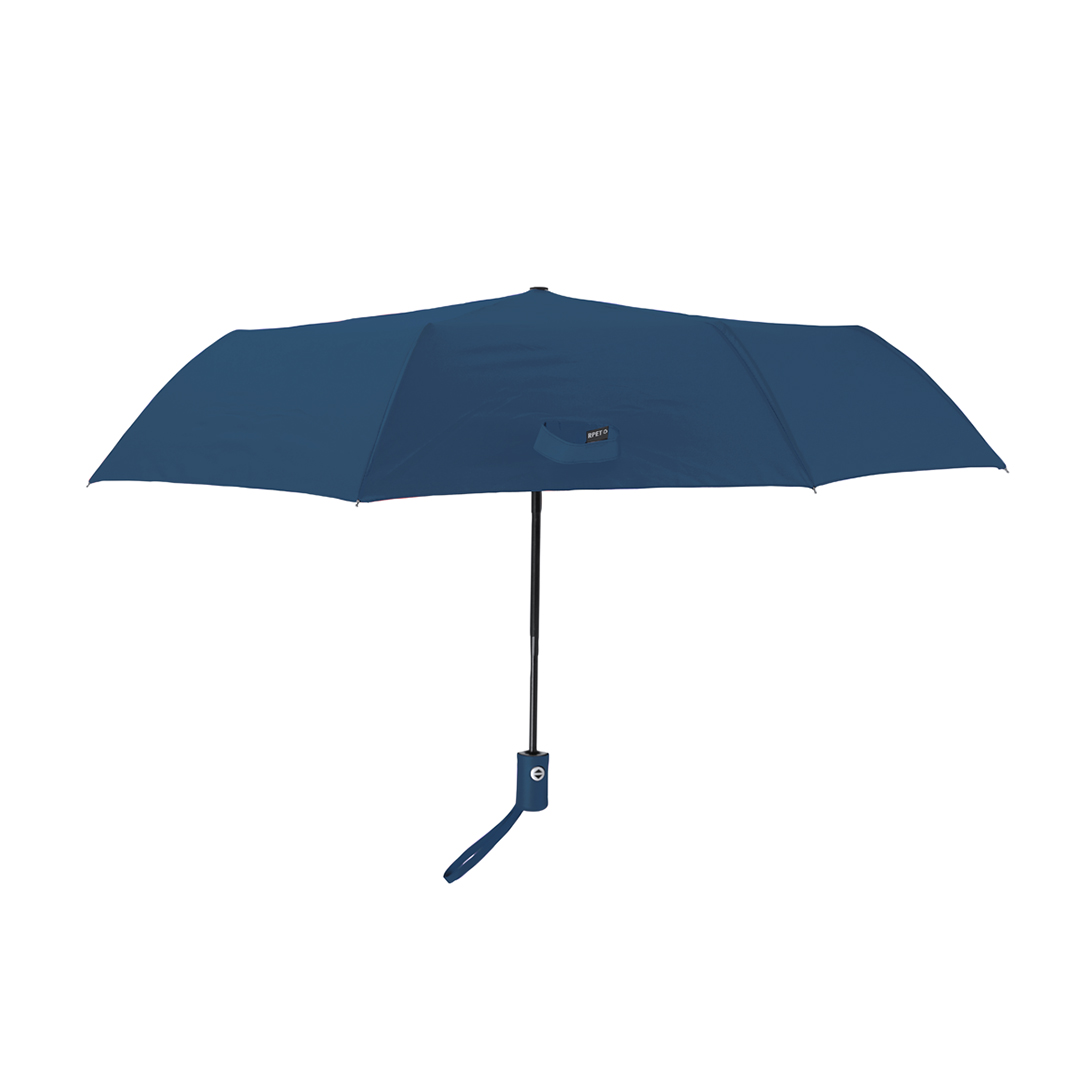 Guarda-Chuva Santana Dobrável com Diâmetro de 98 cm em material pongé 190T RPET e 8 painéis. Abertura e Fechamento Automáticos, mecanismo à prova de vento e varetas de fibra de vidro. Cor correspondente, toque macio, cabo de borracha, com capa e fita de cor correspondente. Com etiqueta RPET.
