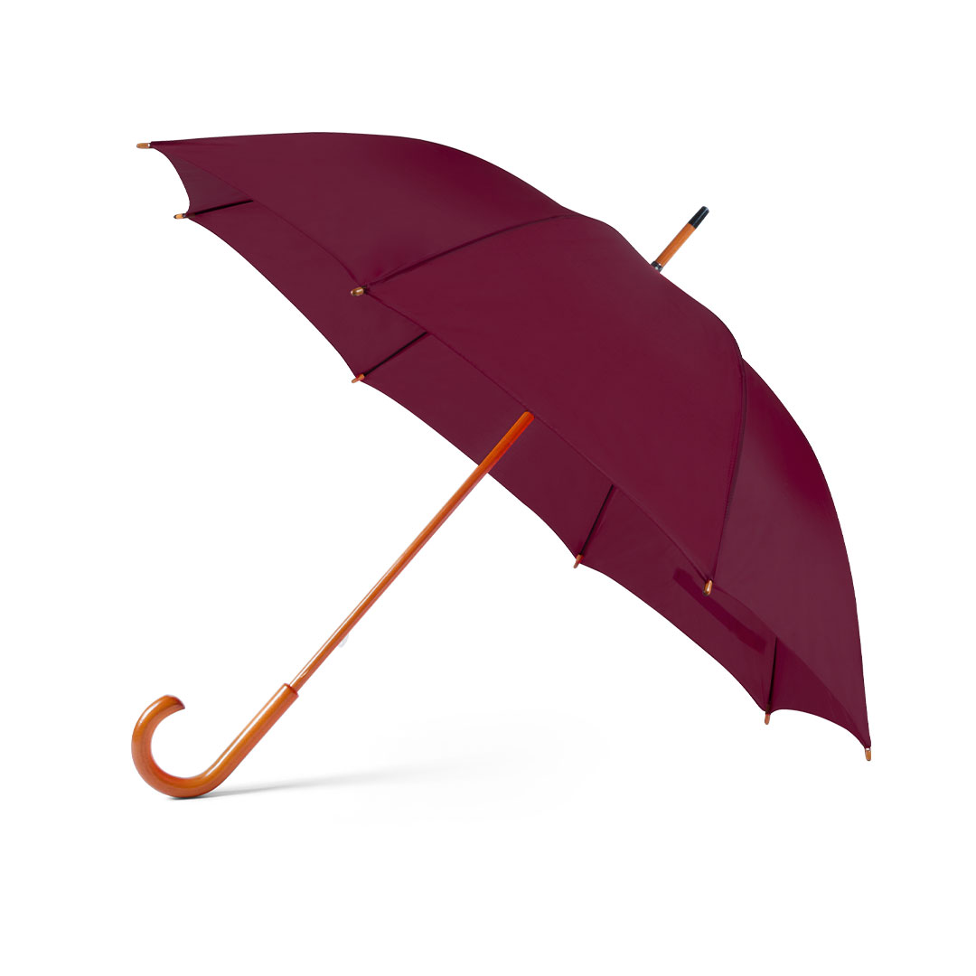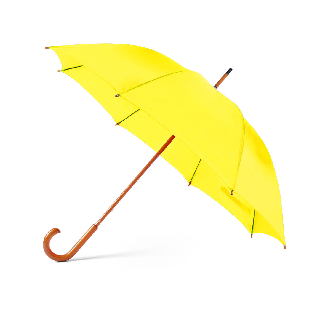 Chapéu-Chuva Santy de 8 painéis confecionado em poliéster. De 105cm de diâmetro, com abertura manual e com varas metálicas em cor preta negro, fecho de velcro e suave cabo de madeira na cor natural, numa variada gama de cores vivas.
