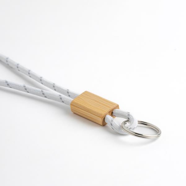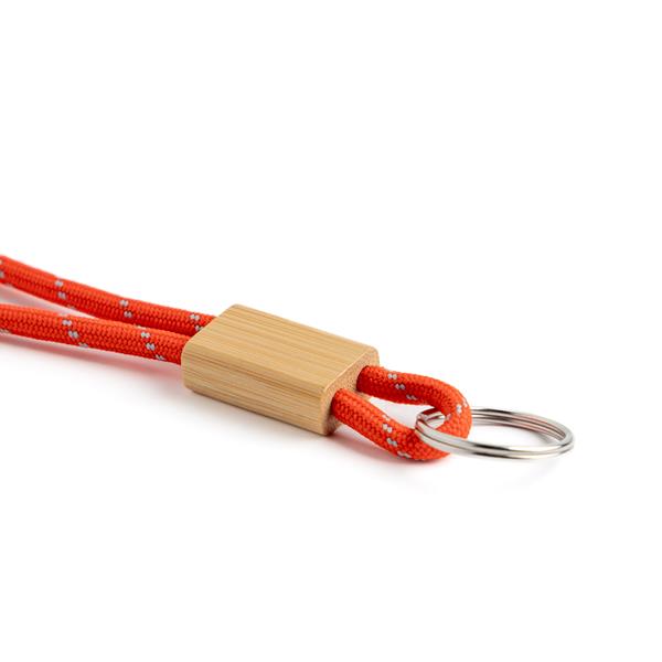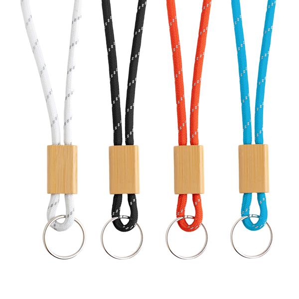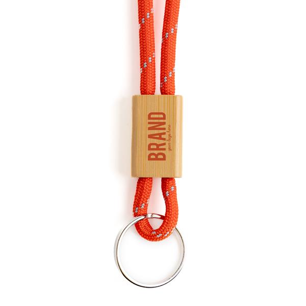 Porta-Chaves Vimeiro Tubular em Poliéster, Ajustável em Bambu e Mosquetão. Este porta-chaves destaca-se pelo seu design tubular, conferindo-lhe um toque moderno e descontraído. O ajustável em bambu dá-lhe um toque de modernidade e sustentabilidade. Adicione o seu logotipo, slogan ou design exclusivo para criar uma peça única que reflete a identidade da sua marca.