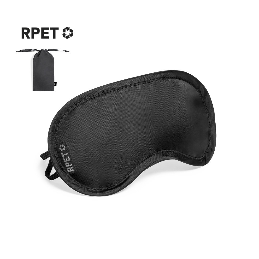 Máscara de Viagem Buxtok de suave e confortável ajuste, disponível numa variada gama de cores. Fabricada em RPET, com duplo elástico de fixação e apresentada numa bolsa individual a condizer de RPET com fecho de cordão. Distintivo RPET na máscara e bolsa.