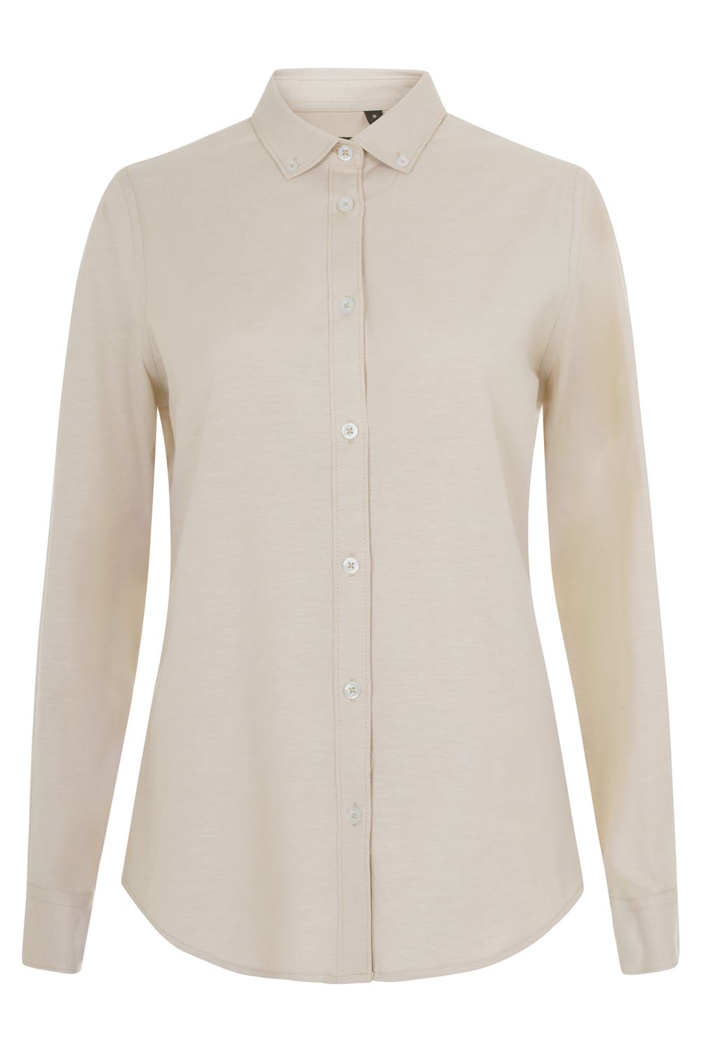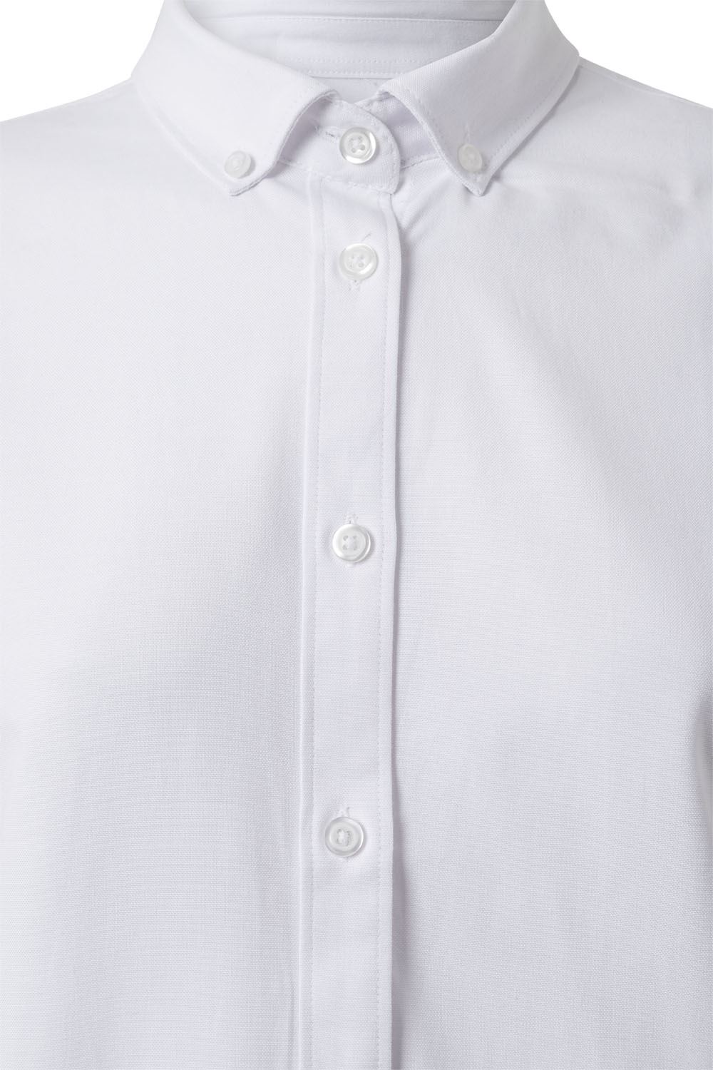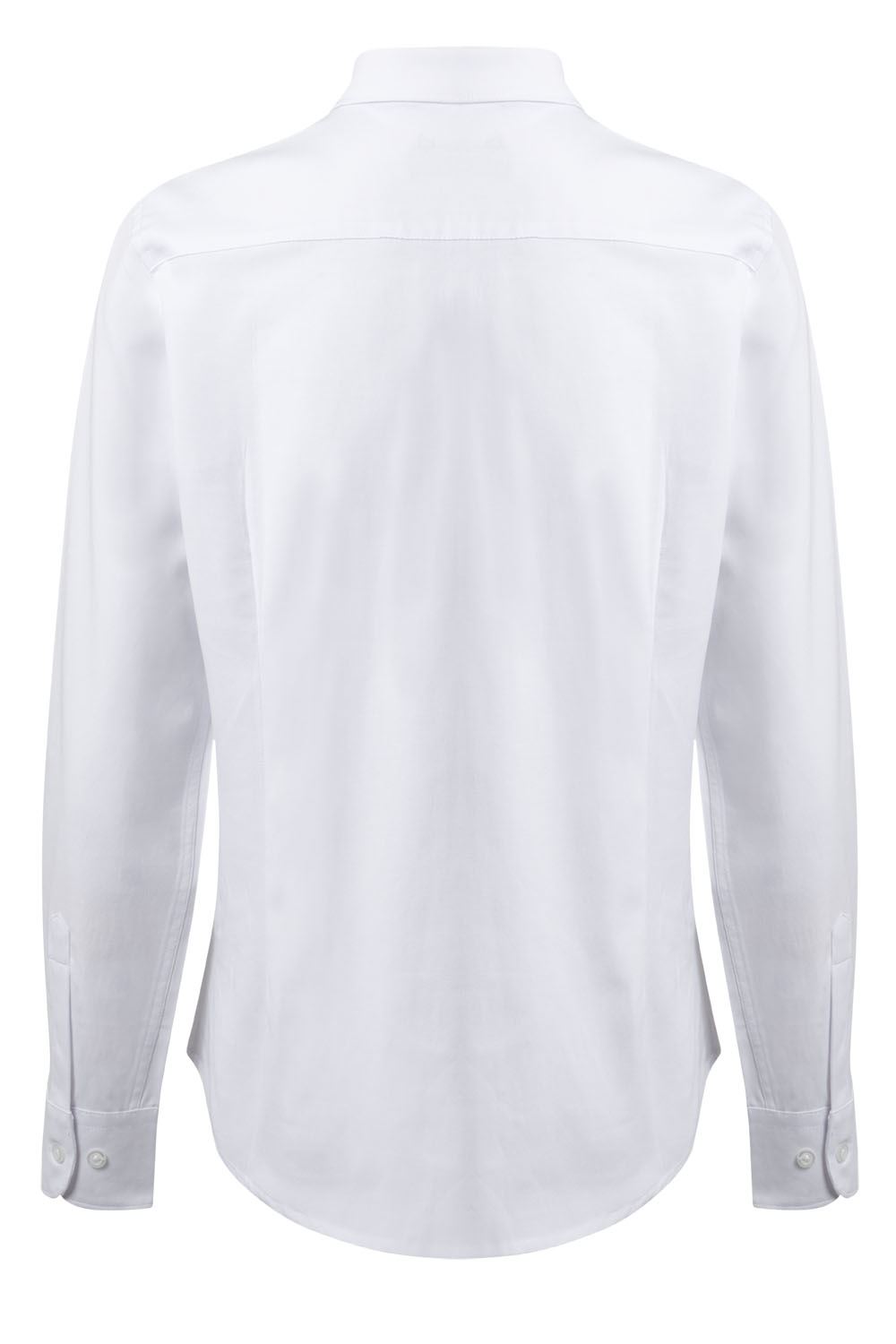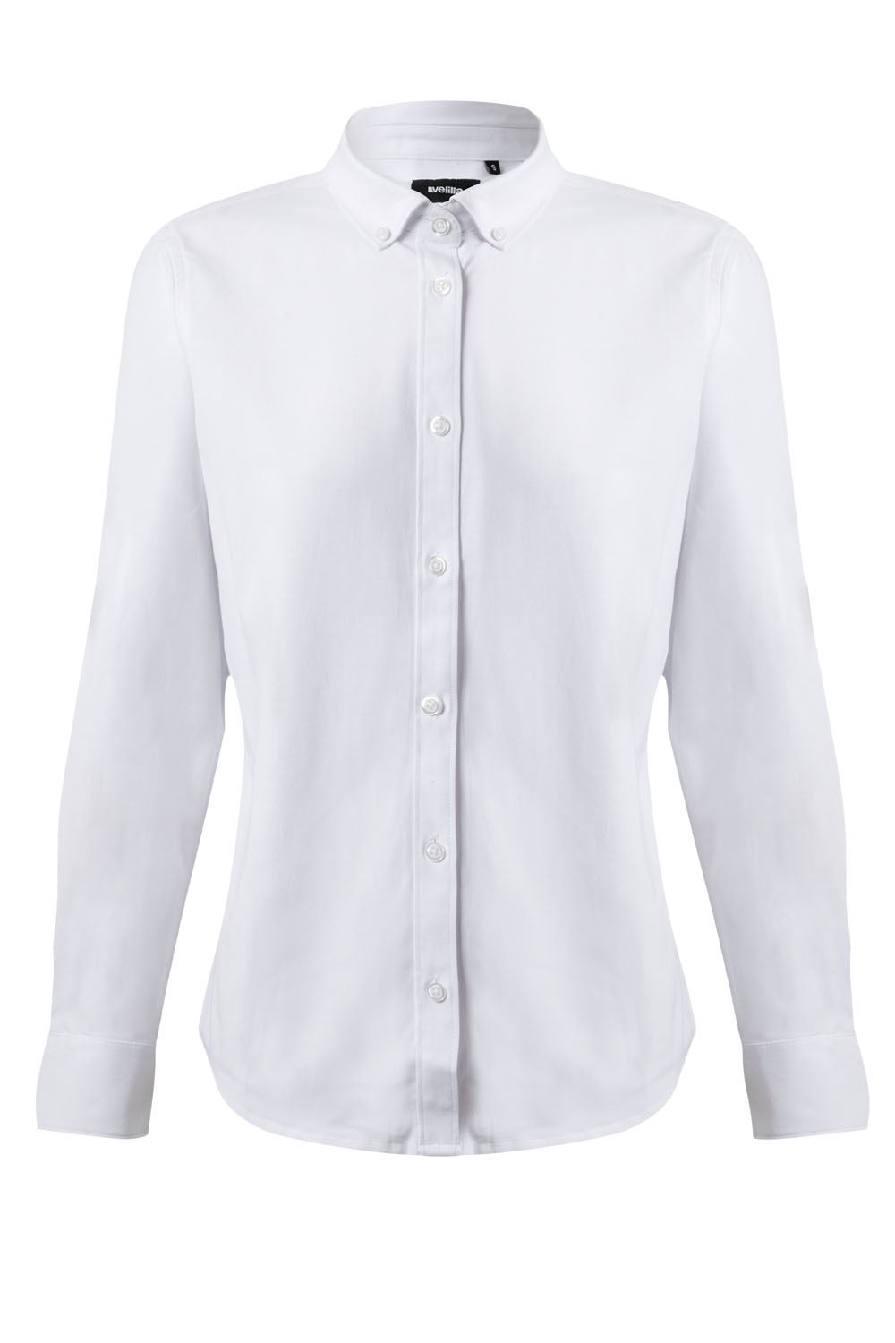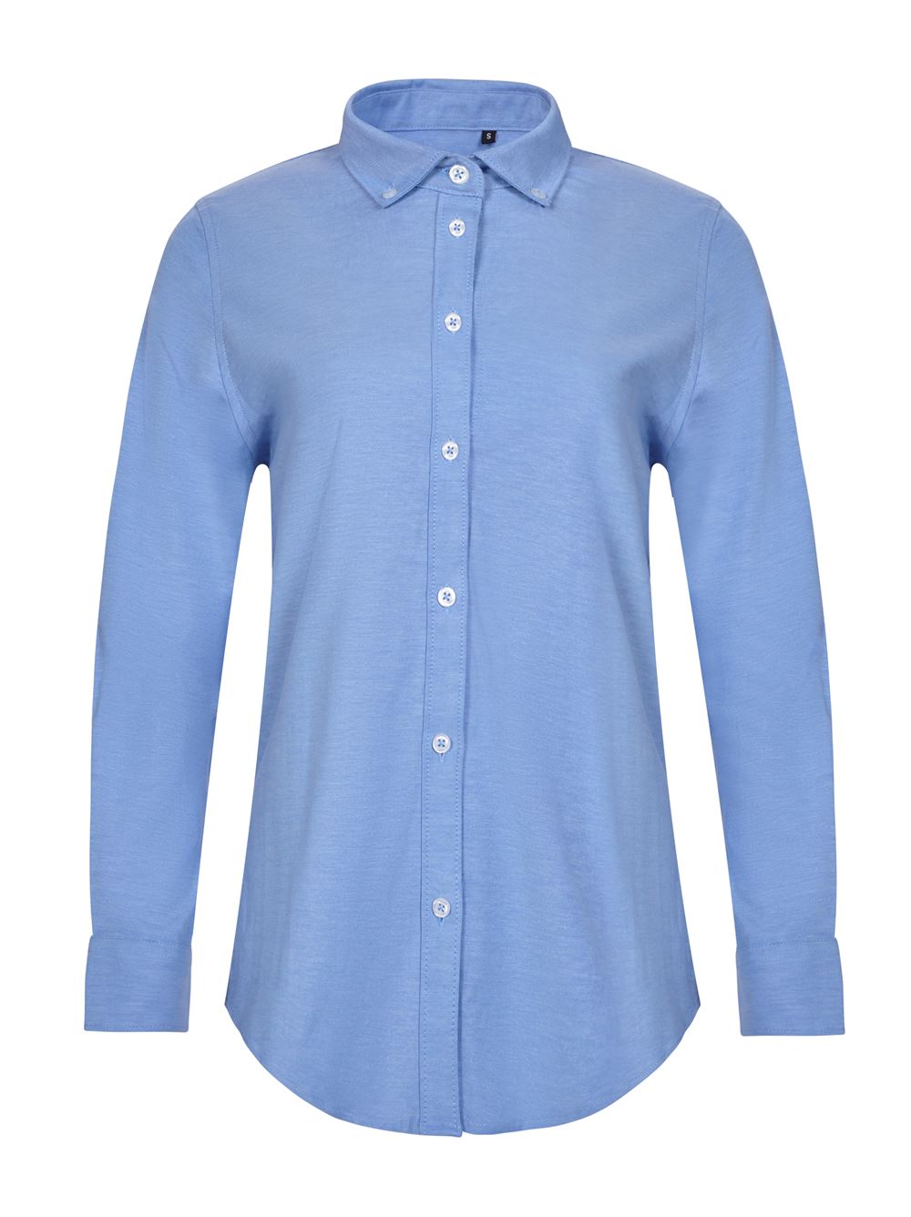 Camisa Oxford Stretch Manga Comprida de Mulher. Fecho central com carcela inglesa. Gola camiseira com botões – Punho arredondado com fecho de botão, Botões extra. Pinça para ajustar nas costas. Tecido Stretch Oxford Stretch 50% Algodão – 45% Poliéster – 5% Elastano – 180 GSM