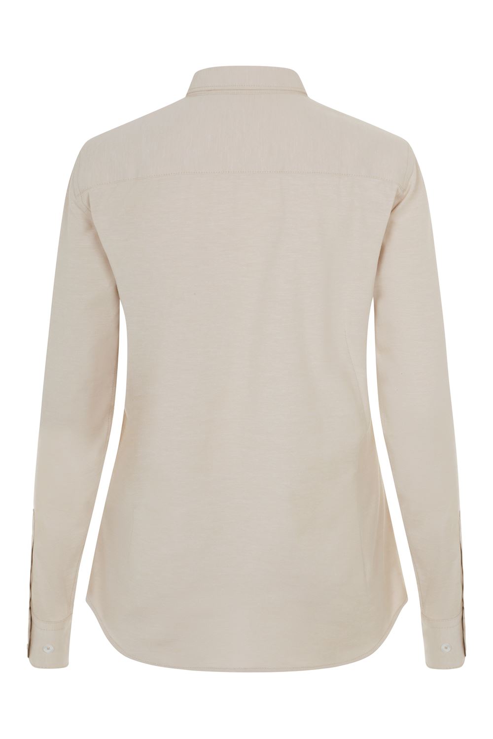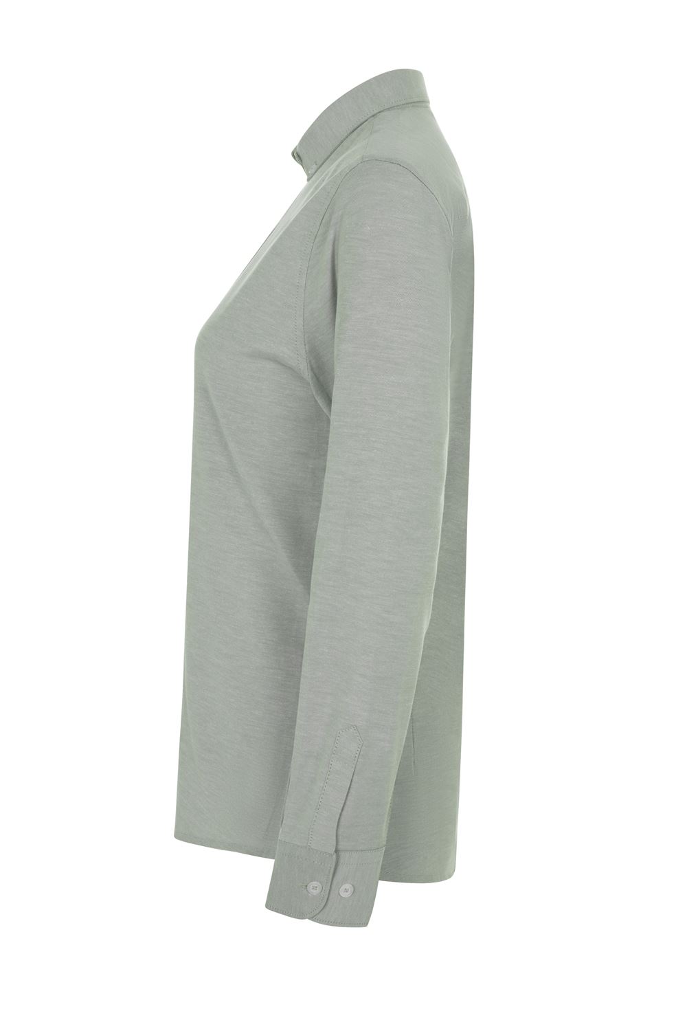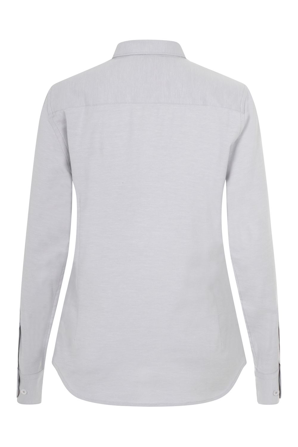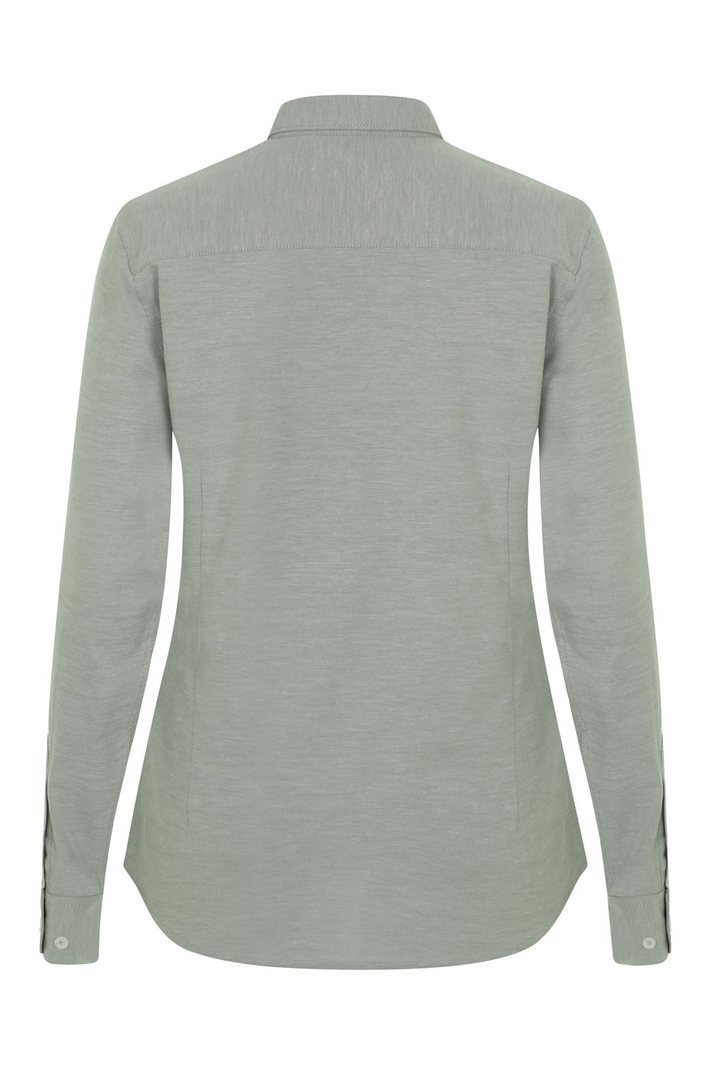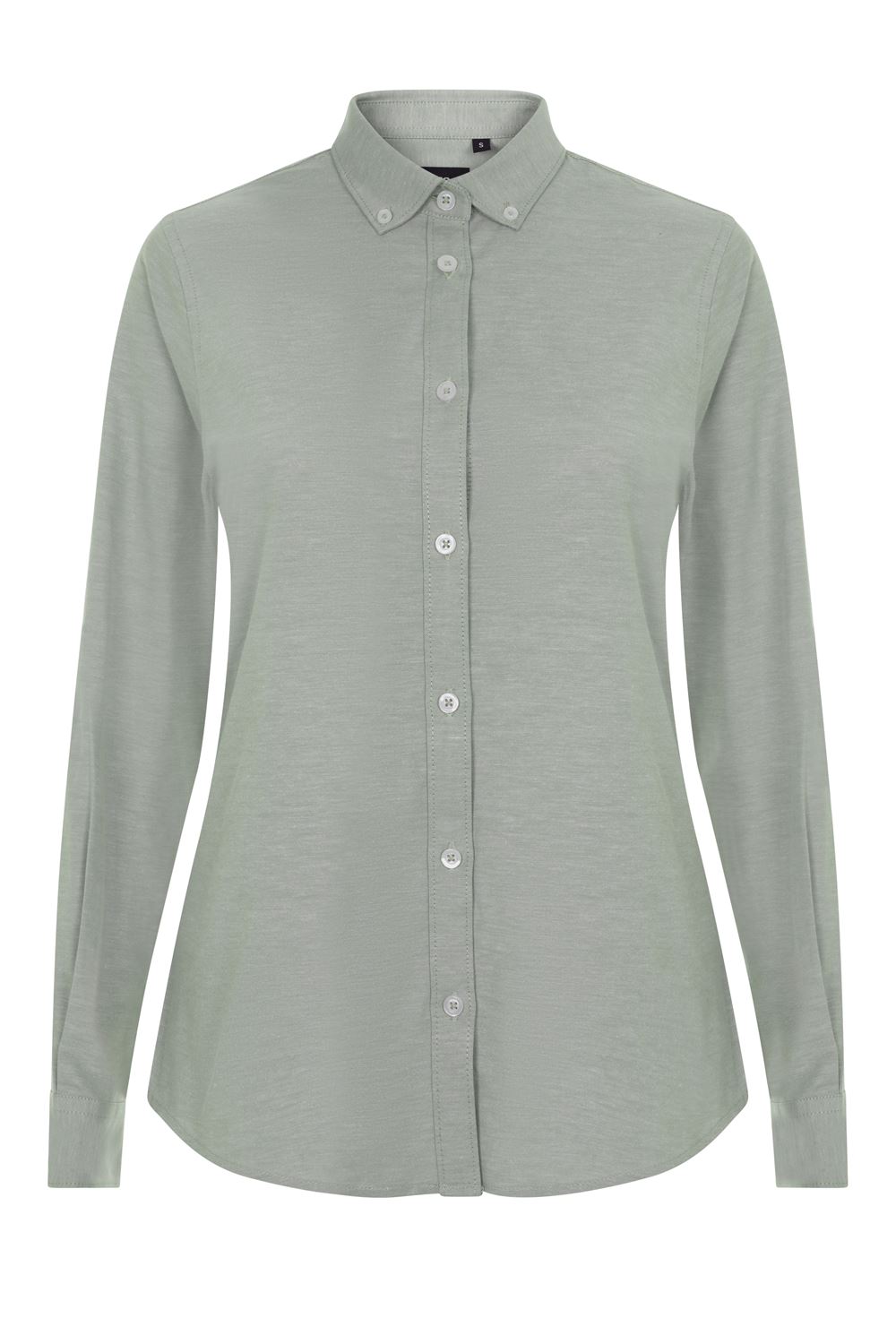 Camisa Oxford Stretch Manga Comprida de Mulher. Fecho central com carcela inglesa. Gola camiseira com botões – Punho arredondado com fecho de botão, Botões extra. Pinça para ajustar nas costas. Tecido Stretch Oxford Stretch 50% Algodão – 45% Poliéster – 5% Elastano – 180 GSM