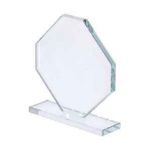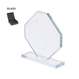 Troféu Kuder de vidro de design retangular com base em bambu. Inclui estojo de apresentação de design kraft.