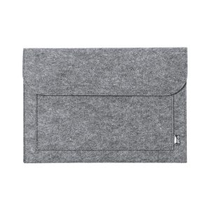 Bolsa para Computador Portátil Riley em Resistente Feltro RPET Reciclado. Aba com fecho elástico e bolso frontal, com distintivo RPET na etiqueta exterior. Para portáteis de até 15 polegadas.